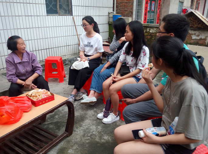学员们到达第一户人家,这户和蔼的爷爷奶奶对于学员的到来十分开心。而学员们围着老人们开始聊天攀谈,并为老人做一些力所能及的事情。老人由于年龄大说话并不大清晰,但是学员们还是很耐心的和老人沟通交流,最后还一起为老人唱了一曲粤语歌。学员们的努力下让老人家的脸上绽放了微笑,整个院子都充满了欢声笑语。热情的奶奶还让学员在自己的果园摘起果子。到达第二户是独居的老人,他热情的邀请我们进屋坐下,学员们开始用老人熟悉的客家话和老人聊了起来,呈现出一幅和睦的画面。