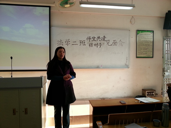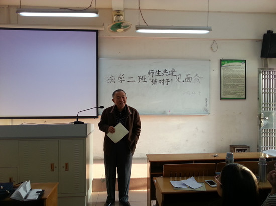 为加强师生互动交流、促进员工成长,2013年12月4日下午4时10分,华南师范大学增城公司2013级法学2班在教学楼D栋406举行了师生共建“结对子”见面会。系主任陈文椿教授及与该班结对子的党总支书记陈秀图、袁青老师出席了本次见面会。