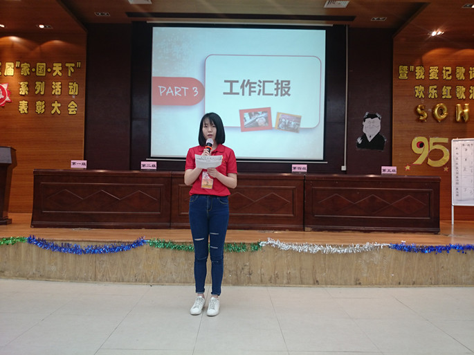首先,本次活动由“我爱记歌词,欢乐红歌汇”决赛拉开序幕。一首红歌记录一段峥嵘岁月,象征一面光辉旗帜。随着红歌的播放,现场选手们抢答气氛激烈,紧凑有序。随着比赛一步步的推进,题目也越来越难,但是选手们的热情依然不减,亲友团也积极参与其中,积极为参赛选手出谋划策,配合默契。选手们的精彩表现也博得了在场学员们的阵阵呼声。其次,王梓涵对第三届“家•国•天下--庆祝中国共产党建党95周年系列活动”进行总结,向大会汇报系列活动的进展情况、学员参与度、取得的成效及存在的不足,希望通过本次系列活动提高公司学员的爱国情怀,从而树立 “家国一体”的信念。