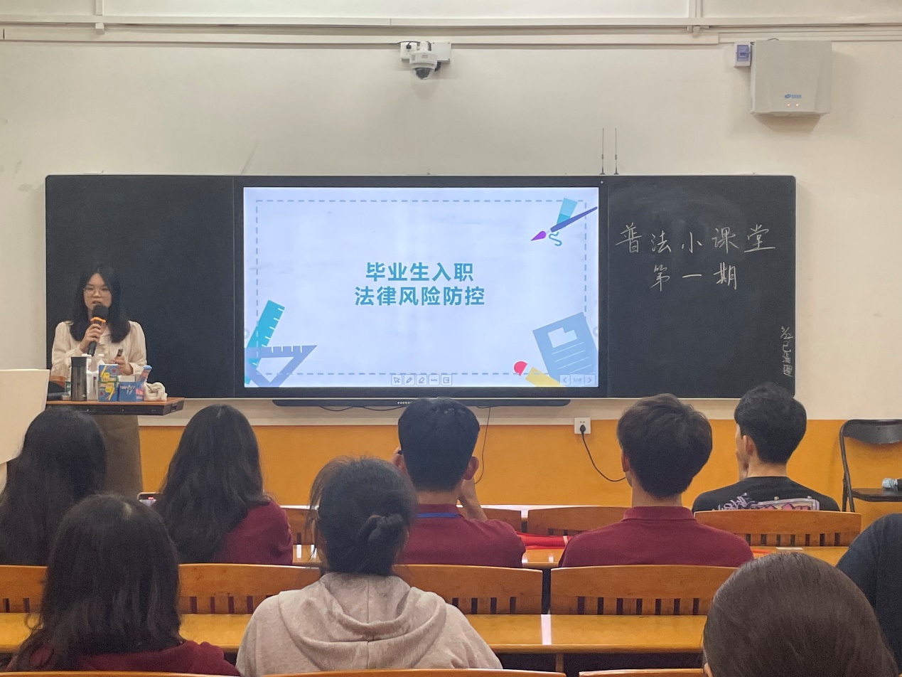首先,第一位宣讲人张昊琦,其宣讲的主题是《毕业生入职法律风险防控》。她用事例引出在毕业求职中会遇到的法律风险,从法律角度分析该风险并结合《劳动合同法》中相关法条提供相应解决途径,使同学们懂得如何使用法律保障自己的合法权益,从而规避求职中的风险。