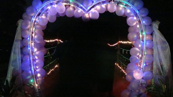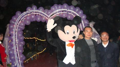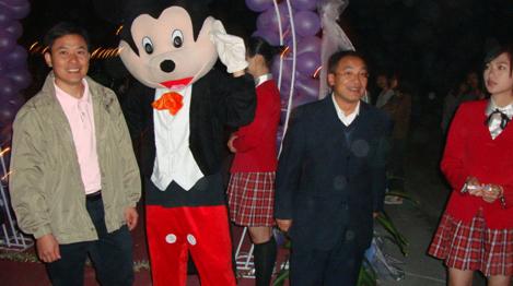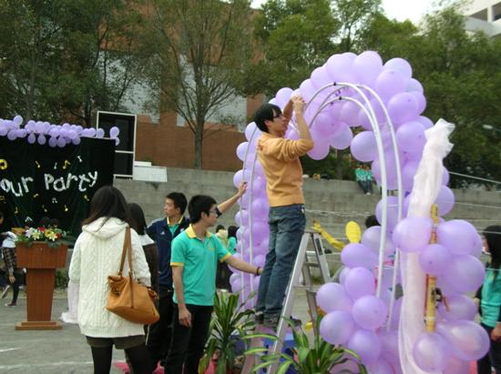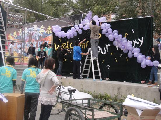 晚会布置,是众人对此次活动的第一印象,所以我们也花大量的精力去构思,三方宣传部更是合作紧密,力求为此次晚会呈现不一样的风格。在多次探讨修改下,我们确定了晚会布置——渲染舞会欢快气氛。我们利用人偶米奇带来欢快,带动入场人员小小舞动,并在此留下纪念;我们利用爱心装饰,点缀当晚爱心洋溢。