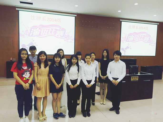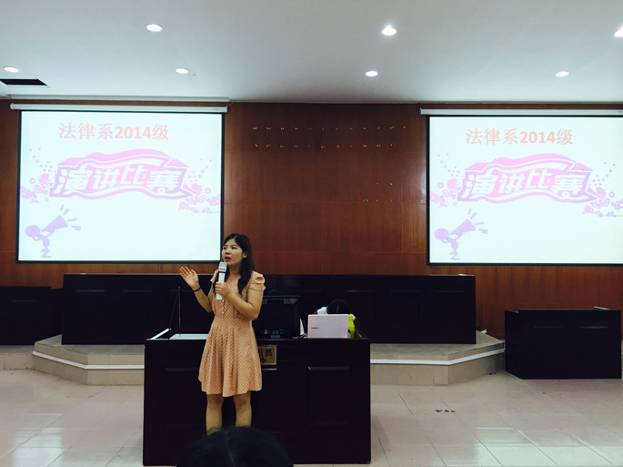为了锻炼同学们的演讲口才和临场发挥能力,同时也为法律系2014级演讲爱好者提供展现自我价值的平台, 5月10日晚7点30分,法律系2014级在教学楼A209举办主题为 “法与德,孰轻孰重” 的演讲比赛。出席本次活动的有2014级辅导员张仁瀞、学长团以及全体2014级员工。本次比赛 由张仁瀞辅导员,学长以及各班代表担任评委。