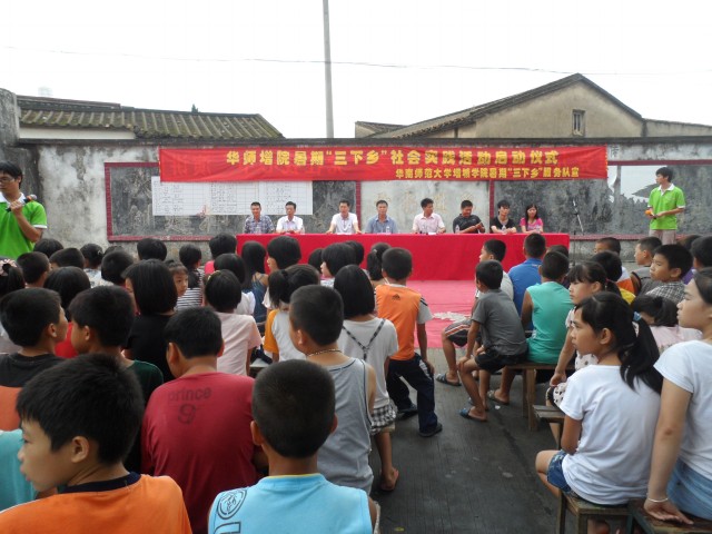 2012年7月5日,华南师范大学增城公司暑期“三下乡”服务队在潭西中心小学举办了隆重的暑期“三下乡”社会实践活动启动仪式。莅临此次仪式的嘉宾分别是:潭西镇中心小学林火金副董事长、潭西村林俊拔村民委员会主任、服务队指导老师冯勤辉老师、张仁瀞老师、叶小办老师,以及潭西镇中心小学庄坤亮主任、团委陈永銮书记。