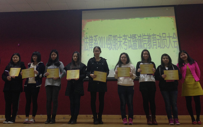 临近期末,2014级新生即将迎来入学来的第一场期末考试,为了让同学们了解考试流程和考场纪律,教育引导新生诚信考试,2014级辅导员张仁瀞老师组织全体员工于1月5日晚在教学楼A206召开法律系2014级期末考试暨诚信教育动员大会。会议由张仁瀞主持并主讲,法律系2014级全体新生出席会议。