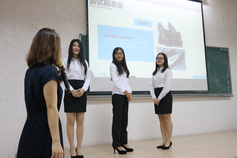 讲座初始,通过从自身的工作经历引入,把整个讲座分为“面试前准备”和“告别礼仪”两大部分。林燕辉给观众传授了正确的面试准备,即通过自身形象(衣着、饰品、妆容等)、面试的小“细节”等方面结合起来。