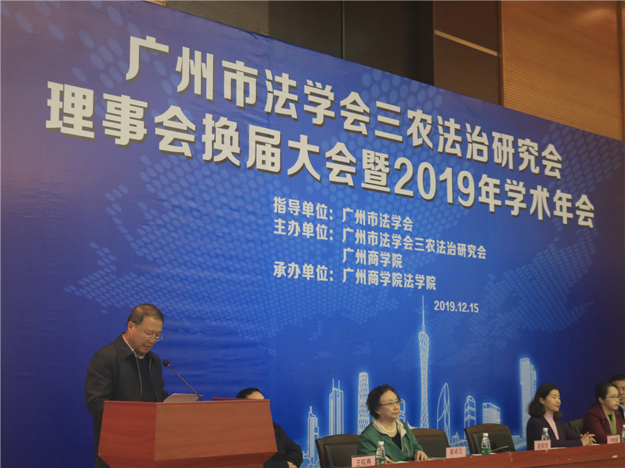 中共广州市委政法委一级调研员、广州市法学会副会长胡宗平致辞。他对研究会换届大会暨2019年学术年会的隆重召开表示祝贺,并强调广州市法学会三农法治研究会要按照广州市法学会学科研究会设置的宗旨和目的开展学术研究,从政治建设、组织建设、学术研究、法律服务、平台建设等多个方面发挥作用。