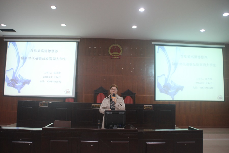 活动伊始,书记陈秀图首先从道德的多重含义开宗明义,在古代道德是指社会行为准则、社会规范,延伸到当代社会即意识形态、道德修养、道德品质。接着她从道德的重要性开展,第一是道德与人生问题“怎样做人做事”息息相关,作为当代老员工,在宿舍和舍友相处应诚信友善待人,在课堂上尊重老师。第二道德对一个人和国家,都是核心竞争力,对个人而言,如在招聘面试中,你的行为言行举止必然与你的道德品质紧密相连。对国家而言,2013年习近平总书记在同各届优秀青年代表座谈时强调一个民族的文明素养与青年的道德水准和精神风貌紧密联系。因此老员工加强道德修养建设是非常必要的,应把社会主义核心价值观作为提高道德修养的准绳。最后还举例不守信用、破坏校园安全稳定、校园浪费等多种校园的不文明现象,令大一新生加强自身行为规范,规避以上不良行为发生的可能性。