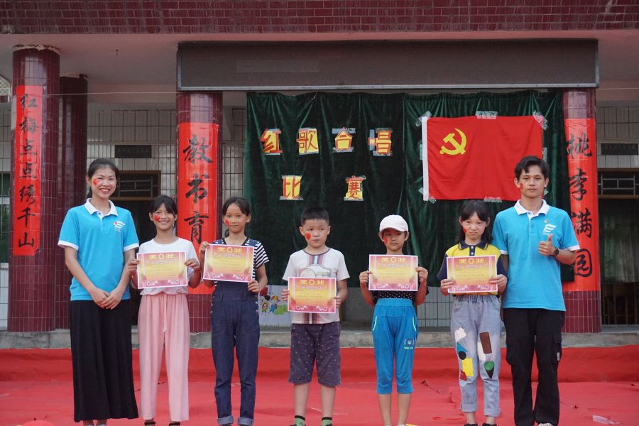 为庆祝新中国成立七十周年,提高同学们对国家和民族的自豪感。7月19日下午,由阳光普法服务队组织开展以 “我爱祖国,童唱国歌”为主题的红歌合唱大赛。出席本次比赛嘉宾评委有阳光普法服务队指导老师肖丽般、李华学、队员邓宝怡、林兆全,比赛由队员伍思德主持。