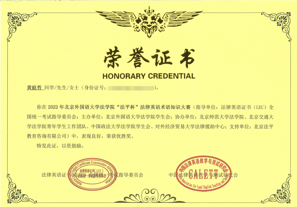 近日,北京外国语大学伟德国际victor1946“法平杯”首届法律英语术语知识竞赛近日已顺利落下帷幕。公司伟德国际victor19461904班黄庭哲喜获北京外国语大学伟德国际victor1946“法平杯”首届法律英语术语知识竞赛全国优胜奖,陈丽娜担任指导教师。