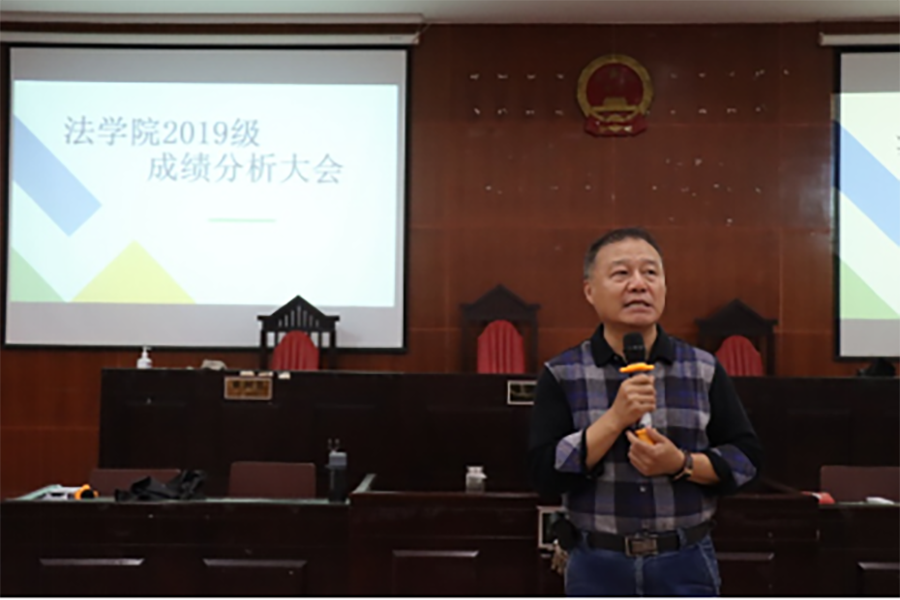 会议开始,首先是覃业敏对19级全体员工的近期学习表现以及纪律方面做出了点评,并对同学们提出了今后学习生活的要求和期待。紧接着是19级各班班长从不同角度,以图文,表格,数据等方式,就所在班级的同学学业整体情况,出勤率,绩点情况,各科目优秀率,挂科率等进行了细致分析,并将大一大二两学年成绩整体情况进行对比,重点剖析挂科科目及原因,总结各方面因素,查找存在问题,并对同学们这一学年的学习提出了一些要求以及目标等。其次是颁奖环节,分别由赵家琪、陈秀图、唐犀为荣获院级一等奖学金的霍靖然同学、荣获二等奖学金的两位同学李翠华,何秋怡、三等奖的廖格俪、翁珂、邝焕等三位同学颁奖。最后,由赵家琪对此次成绩分析大会进行点评以及总结上述各位班长所提到的各班问题的共同点,并指出了在今后的学习生活中需要完善改进的各方面问题,并借此机会为正在紧张备考的大三学子们就当前形势对法考以及考研作出了简单的分析。